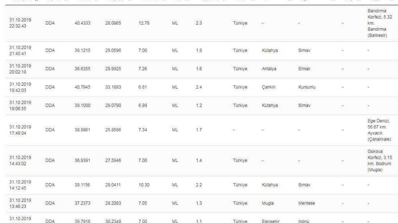 Kandilli Rasathanesi’nin internet sitesinde yer alan verilere göre ise son depremler şu şekilde: