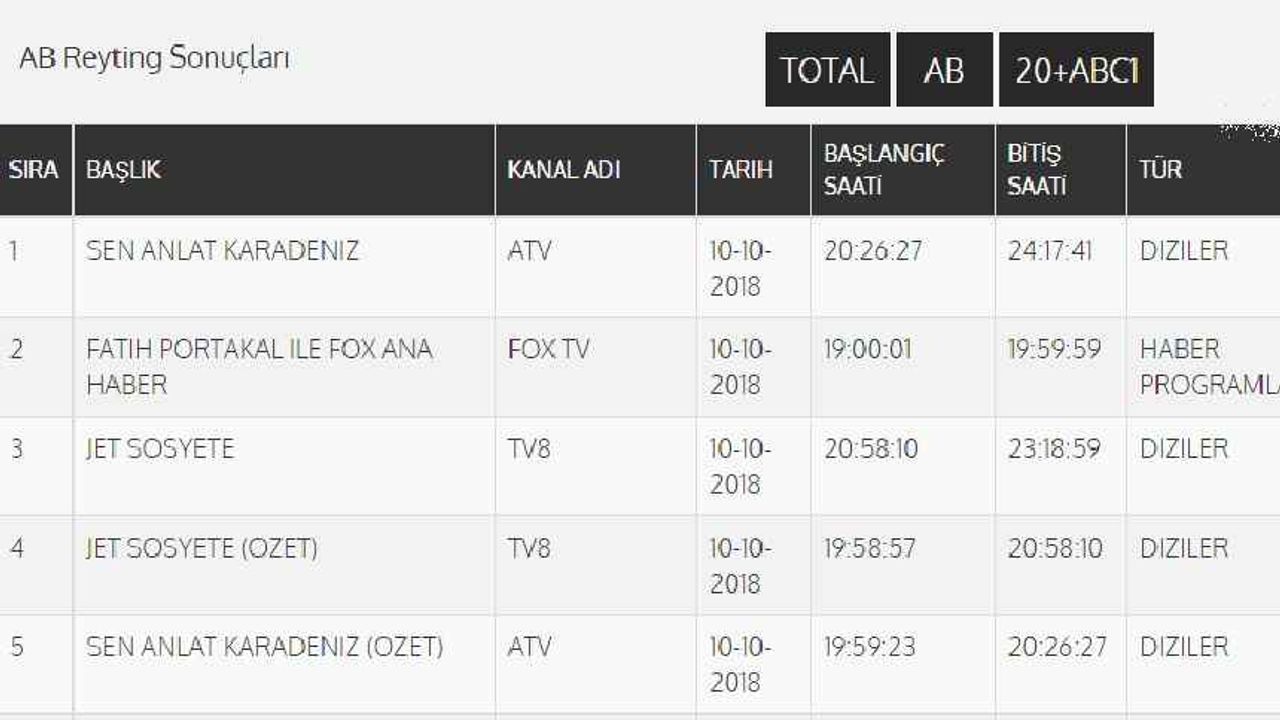 İşte 10 Ekim 2018 AB reyting sonuçları: