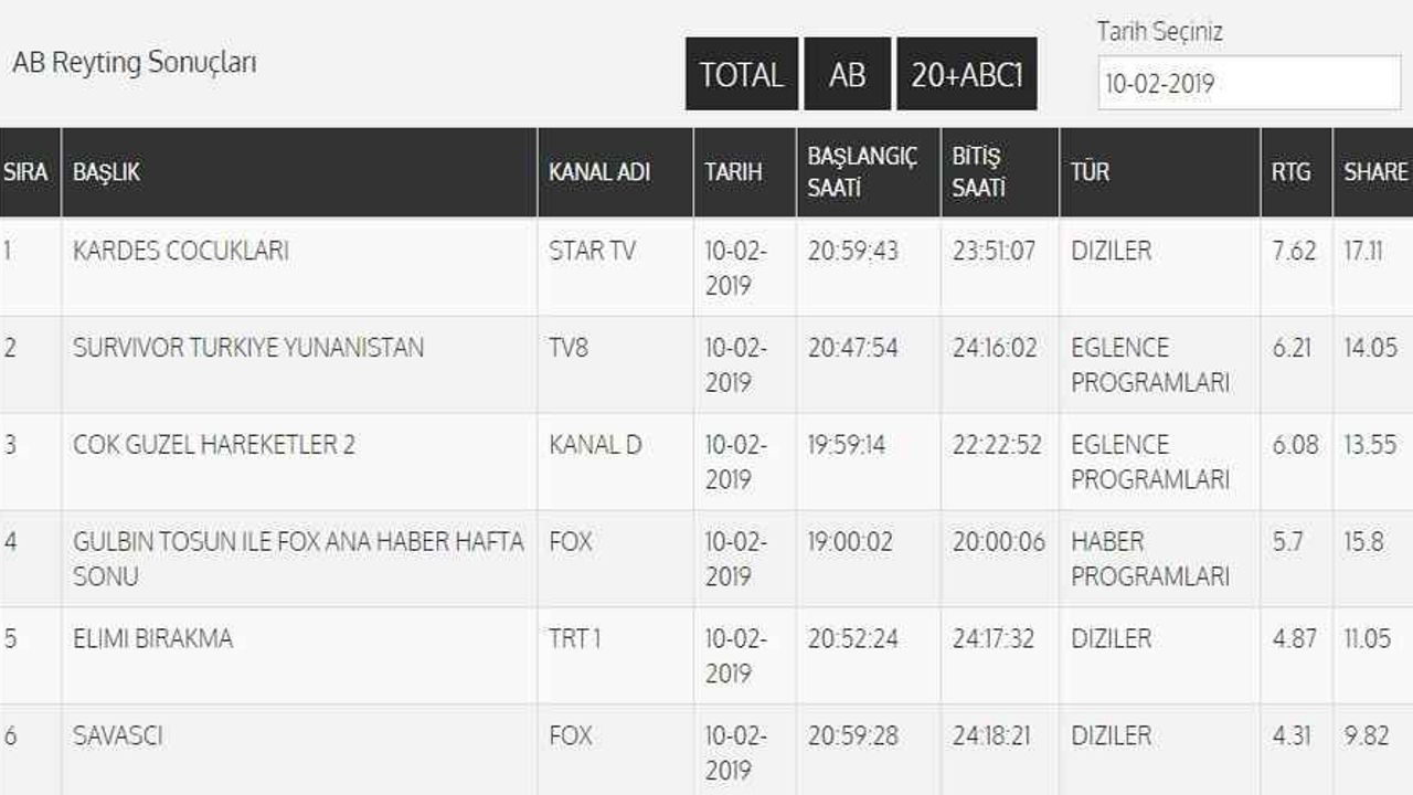 10 Şubat 2019 Total reyting sonuçları: