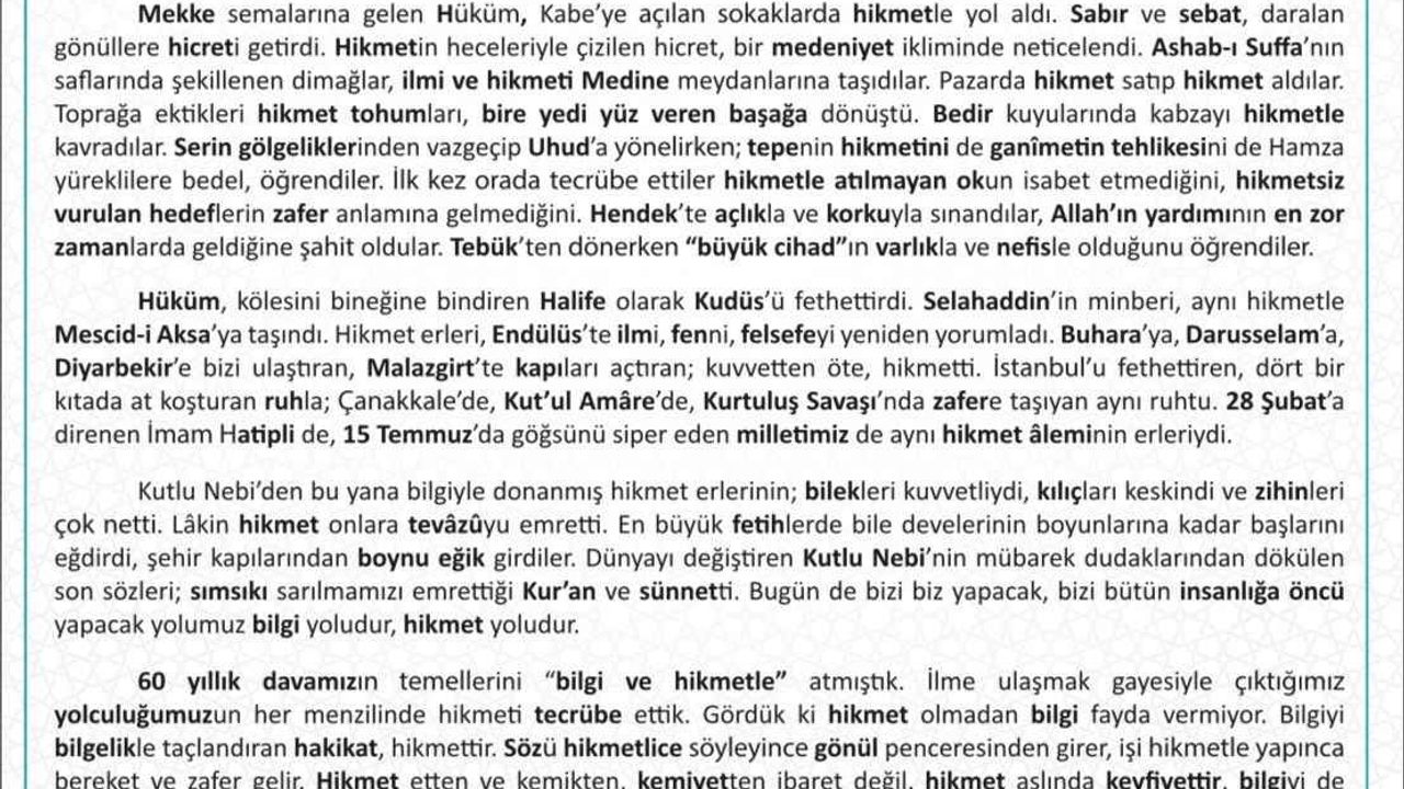 60 yıllık davamızın temellerini “bilgi ve hikmetle” atmıştık. İlme ulaşmak gayesiyle çıktığımız yolculuğumuzun her menzilinde hikmeti tecrübe ettik. Gördük ki hikmet olmadan bilgi fayda vermiyor. Bilgiyi bilgelikle taçlandıran hakikat, hikmettir. Sözü hikmetlice söyleyince gönül penceresinden girer, işi hikmetle yapınca bereket ve zafer gelir. Hikmet etten ve kemikten, kemiyetten ibaret değil, hikmet aslında keyfiyettir, bilgiyi de kuşatan bilgeliktir.
