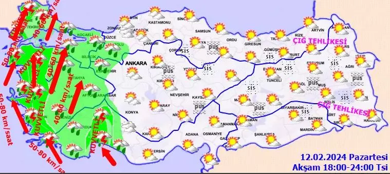 Meteoroloji Genel Müdürlüğü yeni haftanın ilk günü hava tahmin raporunu yayımladı. 12 Şubat Hava tahmin raporunda 3ile turuncu 12 ile de sarı kodlu uyarılar yapıldı. Meteoroloji Genel Müdürlüğü yağış ve çığ tehlikesi uyarısı yaptı.