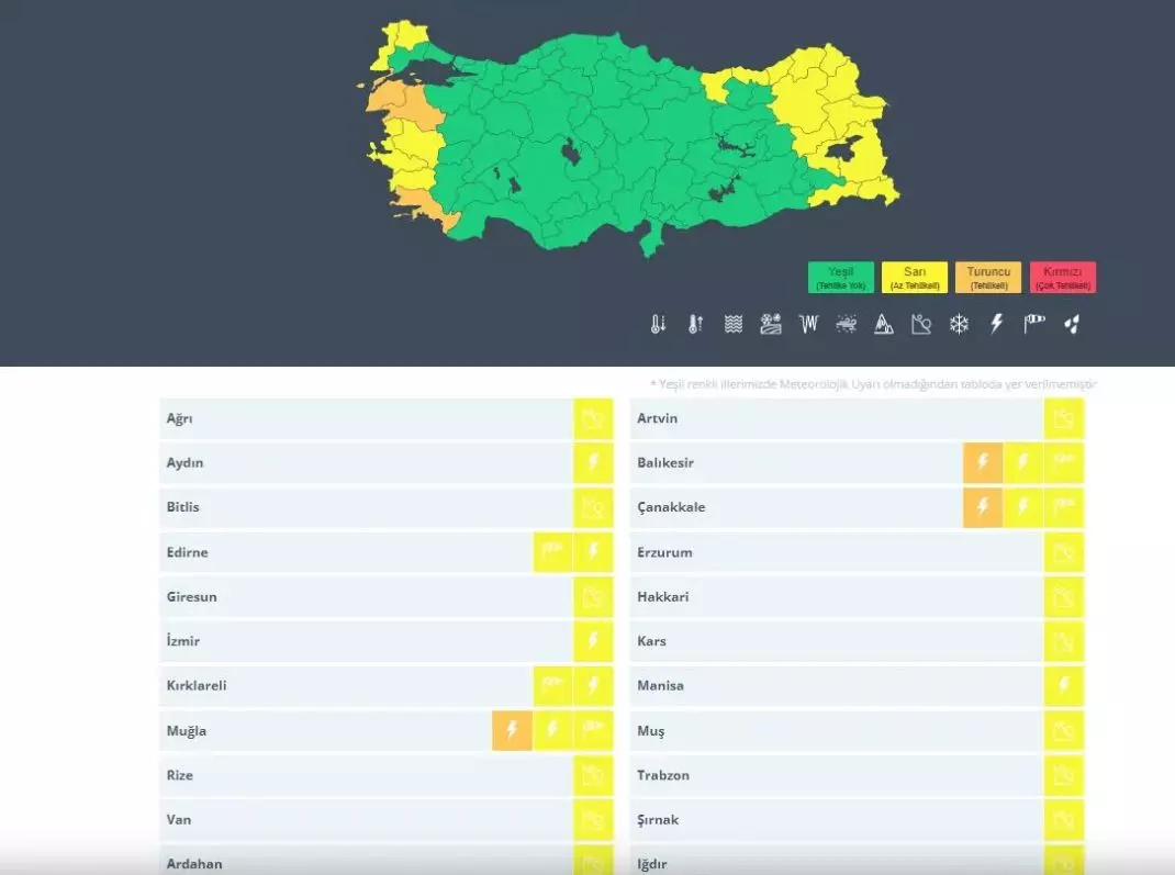 Balıkesir, Çanakkale ve Muğla'da etkili olması beklenen kuvvetli sağanak nedeniyle turuncu kodlu uyarı verildi. 19 ilde ise yağışlar ve çığ tehlikesi nedeniyle sarı kodlu uyarı verildi.