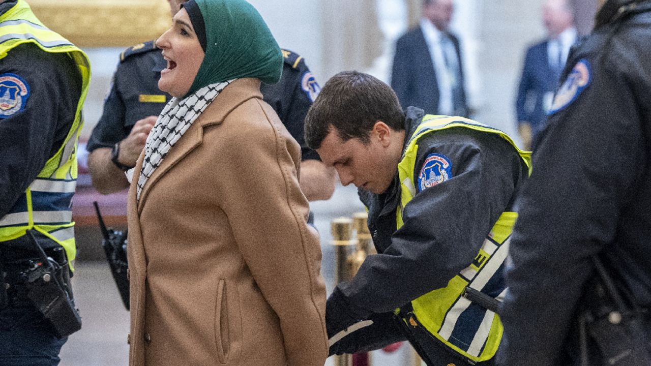 ABD’nin başkenti Washington DC’de yer alan Kongre binasına ziyaretçi kılığında giren bir grup protestocu, İsrail’in Gazze Şeridi’ne yönelik saldırılarını protesto ederek, Gazze’de acil ateşkes çağrısında bulundu. Göstericiler, sık sık “Ateşkes şimdi” sloganı atarken, “İnsanlar yaşamı seçti. Ateşkes şimdi” yazılı pankart açtı.