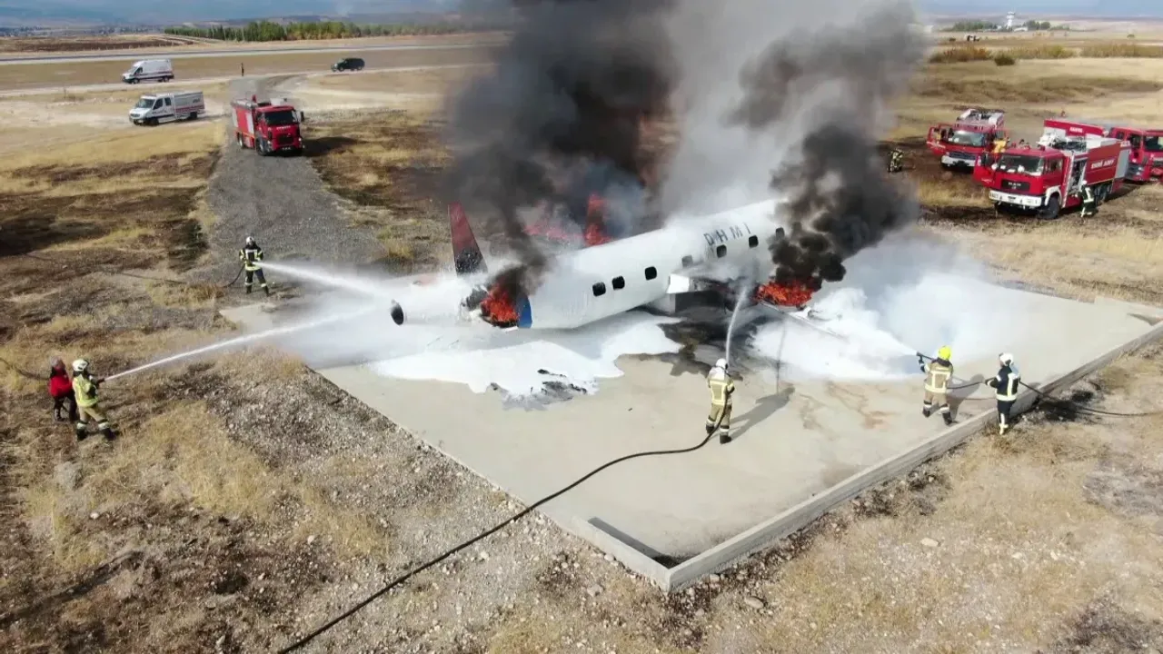 Tatbikat için hazırlanan gerçek boyutlu uçak maketi, kısa sürede alev topuna dönüştü. Bölgeye hızla ulaşan ekipler, uçak motorları ve kanatlarında çıkan yangına köpüklü suyla müdahale etti.