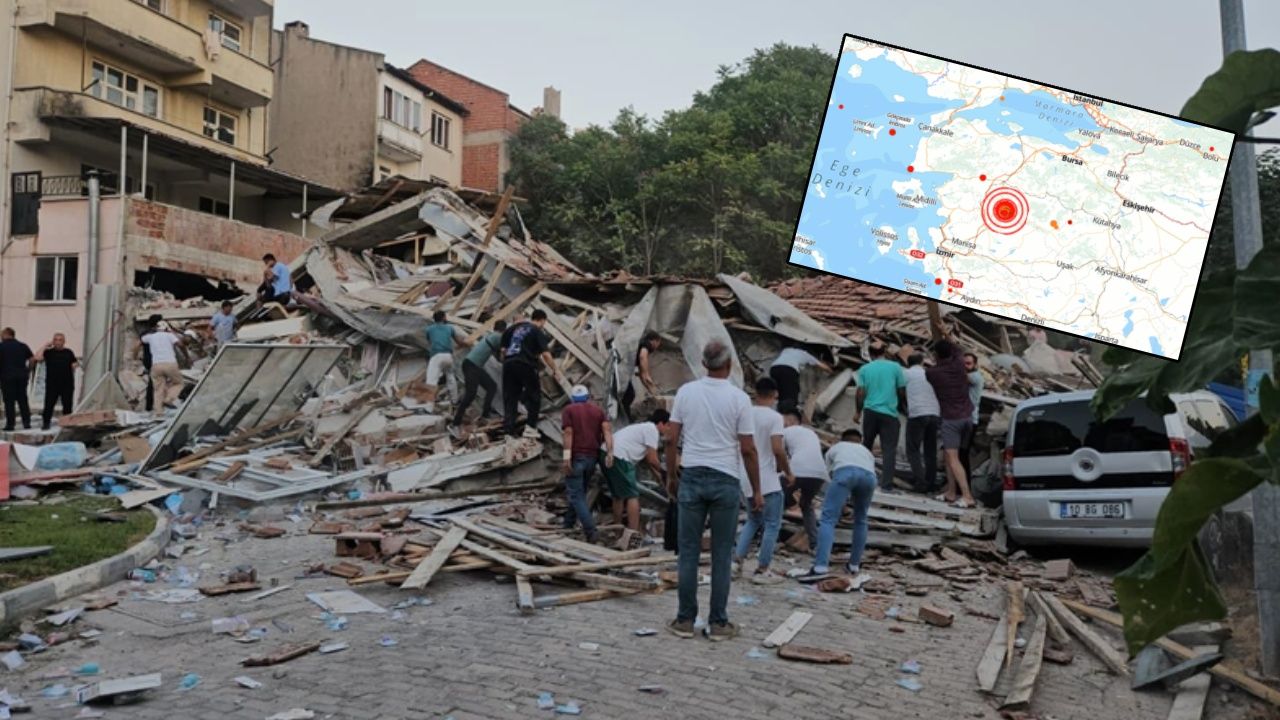 Sındırgı ilçesindeki bir binanın yıkıldığı görüldü.