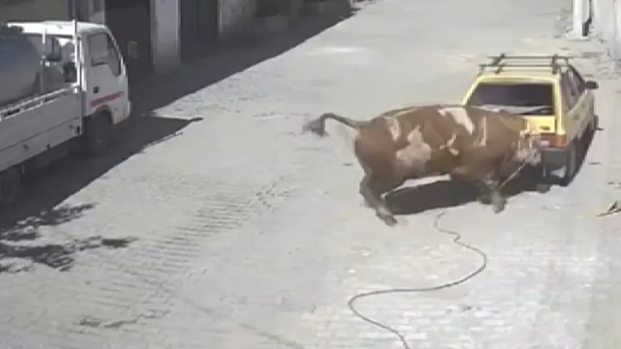 Öfkeli boğa, bir caddede park halindeki otomobile defalarca vurarak hasar verdi.
