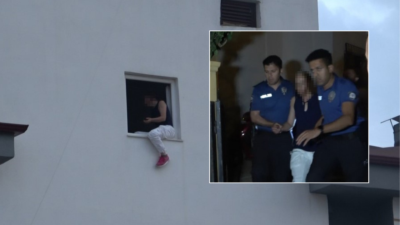Elinde bıçakla direnen kadın, ardından apartmanın çatı katına çıkarak camdan sarktı. Olay yerine gelen polis, itfaiye ve sağlık ekipleri, 4 saat süren çabaların ardından kadını bulunduğu yerden indirdi.