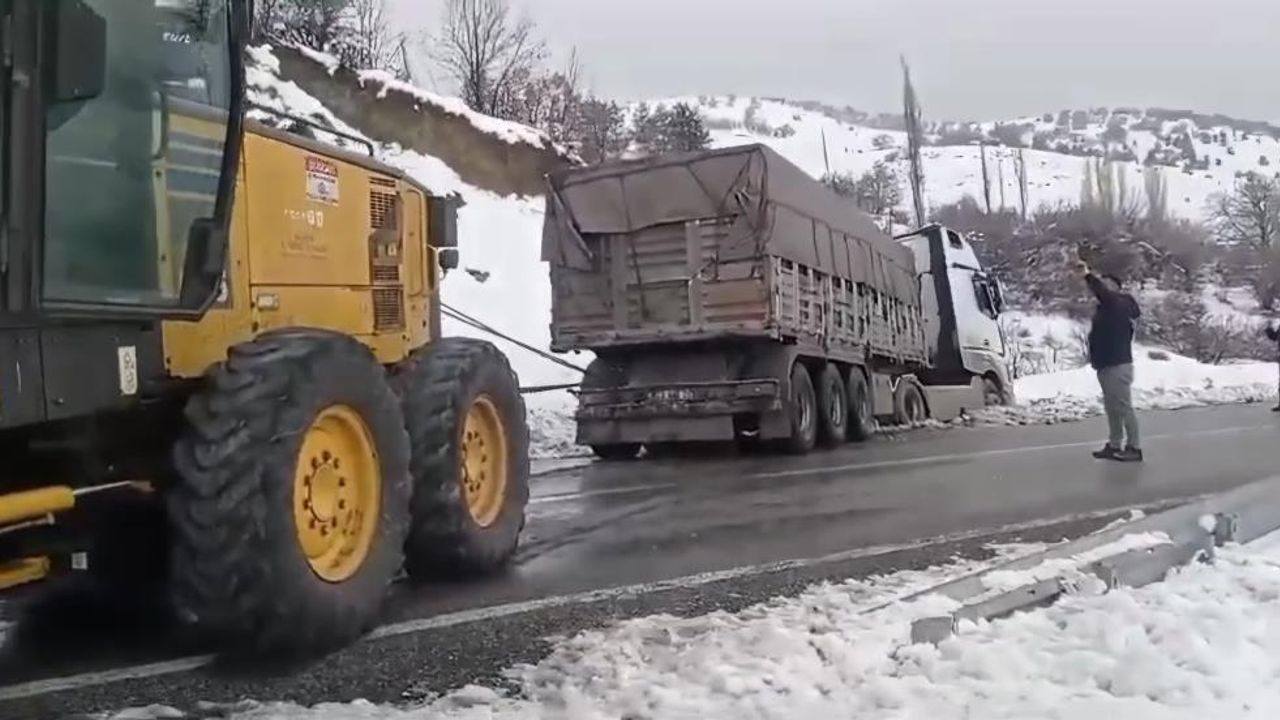 Elazığ'da karlı yolda kayarak yoldan çıkan tırı, İl Özel İdaresi ekipleri kurtardı.