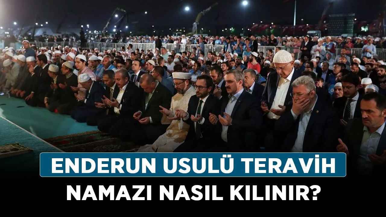 Enderun usulü teravih, Ayasofya-i Kebir Cami-i Şerifi'nin yanı sıra 34 camide kılınacak. Enderun usulü teravih namazı nasıl kılınır? Enderun usulü namazı tarihi nedir? Soruları sıkça araştırılmaya başlandı. Ayasofya-i Kebir Camii'nde ramazan boyunca bazı günler teravih namazı Enderun usulü kılınacak. Enderun Usulü Teravih Namazı, adını Osmanlı’daki Enderun Mektebi’nden almaktadır. İşte Enderun usulü teravih namazı ile ilgili tüm detaylar.