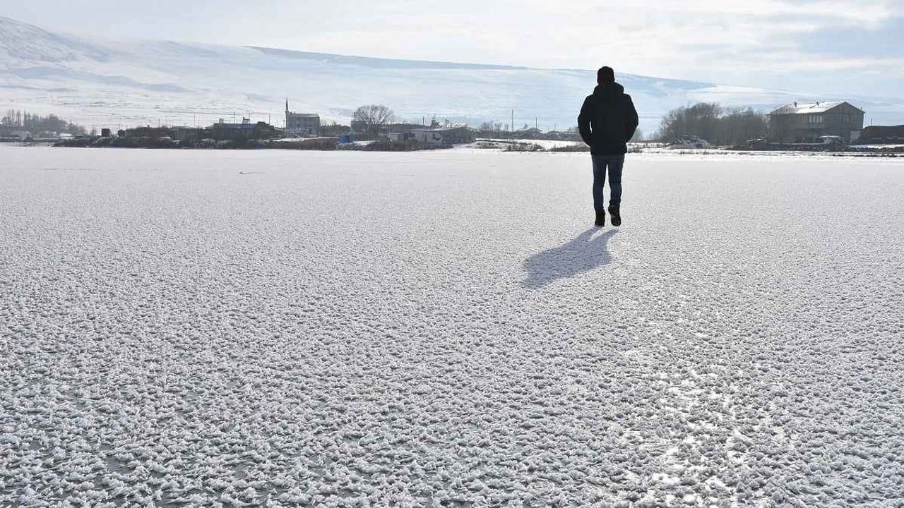 Doğu Anadolu Bölgesi'nde etkisini artıran soğuk hava nedeniyle yüzeyi buz tutan Aktaş Gölü ilgi görüyor.