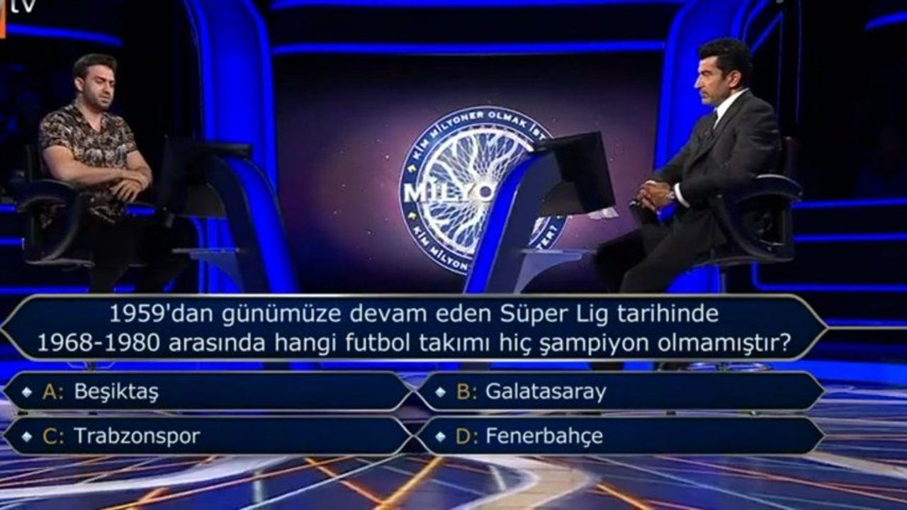 Kim Milyoner Olmak İster'de geceye damga vuran soru sosyal medyada gündem oldu. 200 Bin TL'lik, ''1959’dan günümüze devam eden Süper Lig tarihinde 1968-1980 arasında hangi futbol takımı hiç şampiyon olmamıştır?'' sorusuna yarışmacı yanlış cevap verdi.
