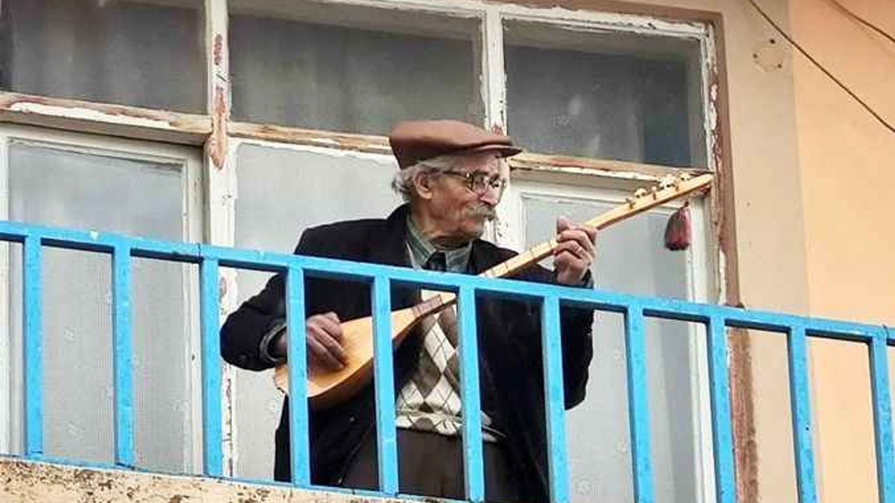 Tunceli’de 96 yaşındaki Hasan Tuncel, korona virüs salgını nedeniyle cura ismi verilen çalgısını alarak evinin balkonuna çıkıp, türkü söyleyerek evde kalın mesajı verdi.