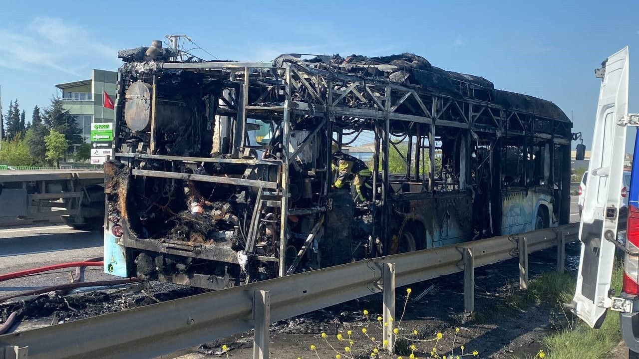 Kocaeli'de belediyeye ait yolcu otobüsü seyir halindeyken alevlere teslim oldu. Yolcu ve otobüs şoförü son anda kurtulurken araç ise demir yığınına döndü.