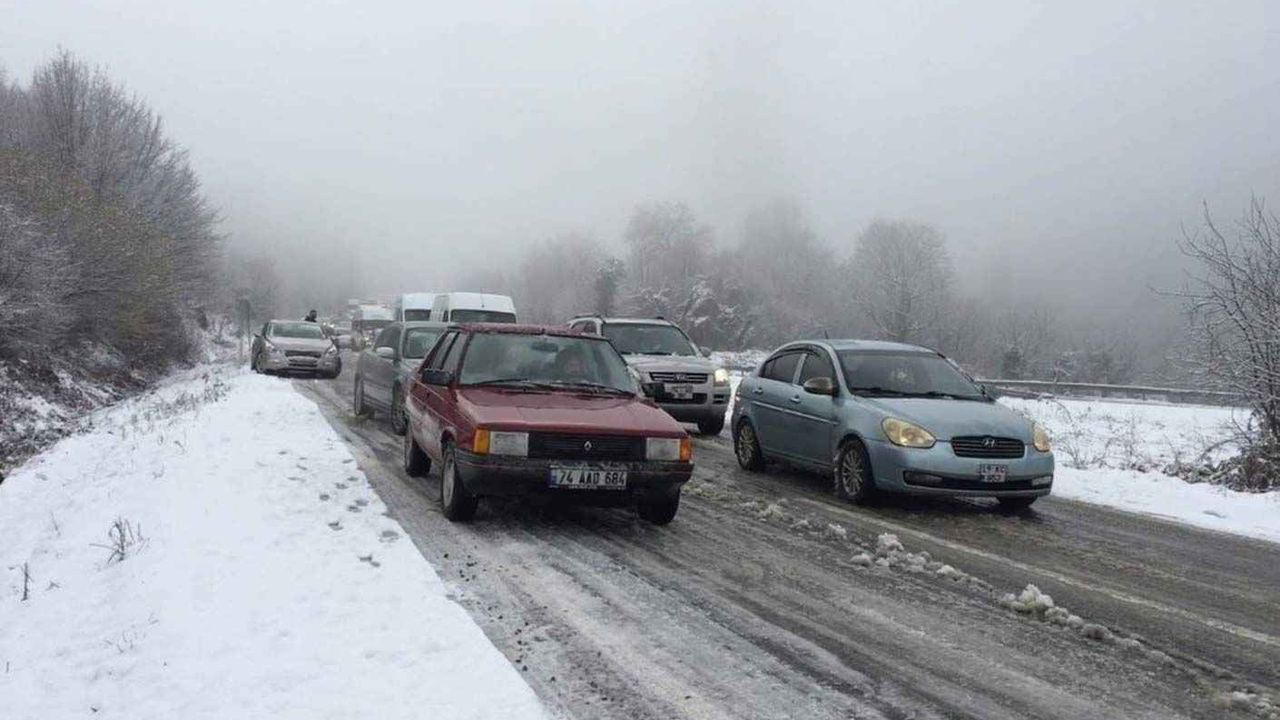 Bartın-Amasra karayolunun Uğurlar köyü mevkiinde kar yağışı nedeniyle yolda kalan araçlar oldu. Bir süre trafiğe kapanan yolda uzun araç kuyrukları oluştu.