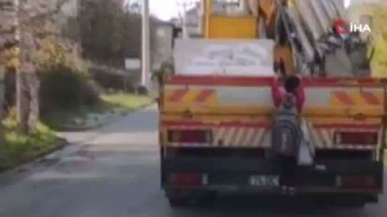 Bartın’da hayatını hiçe sayan vincin arkasına asılı halde yolculuk yapan küçük çocuk yürekleri ağza getirdi.