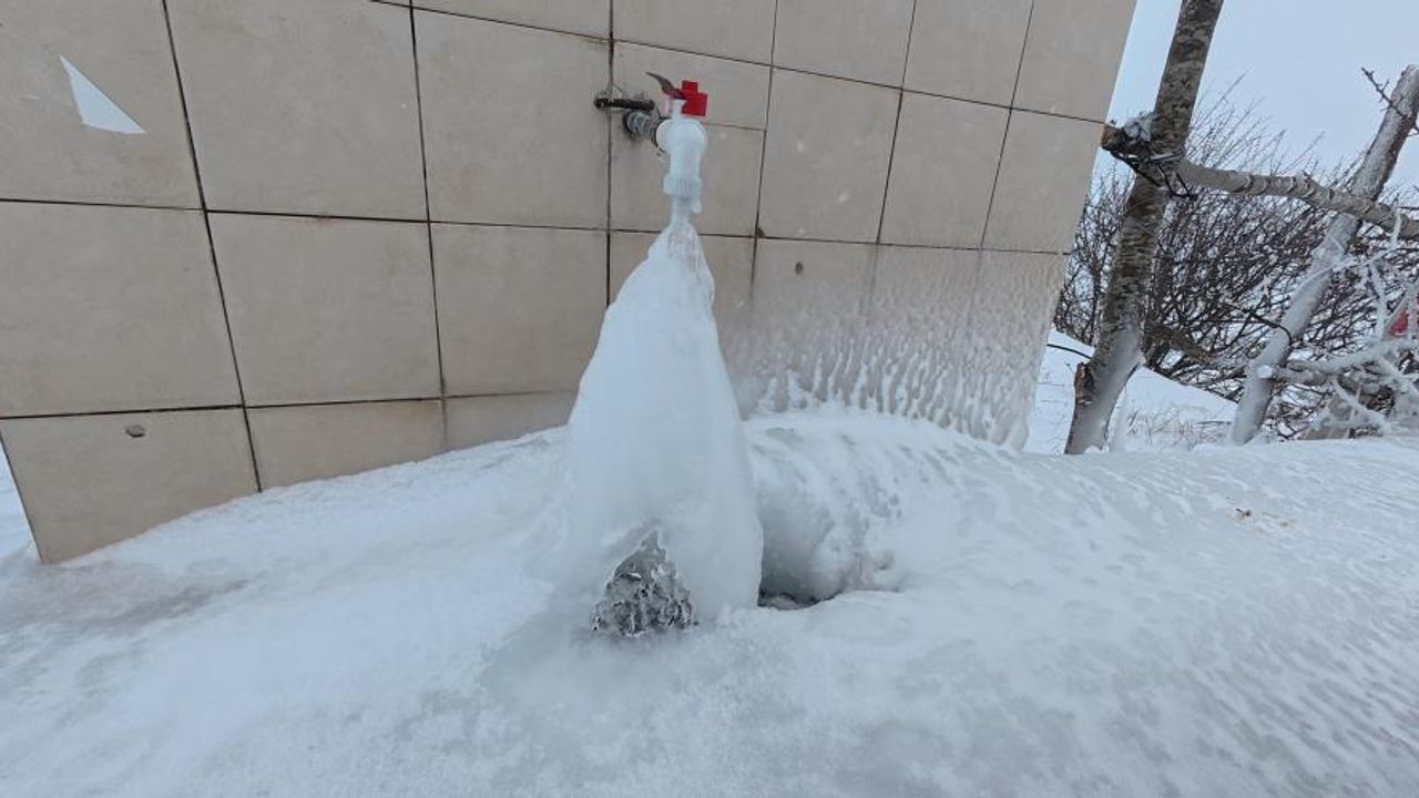 Tokat’ın Reşadiye ilçesinde etkili olan soğuk hava nedeniyle bir çeşmenin akan suyu donarak buz tuttu.