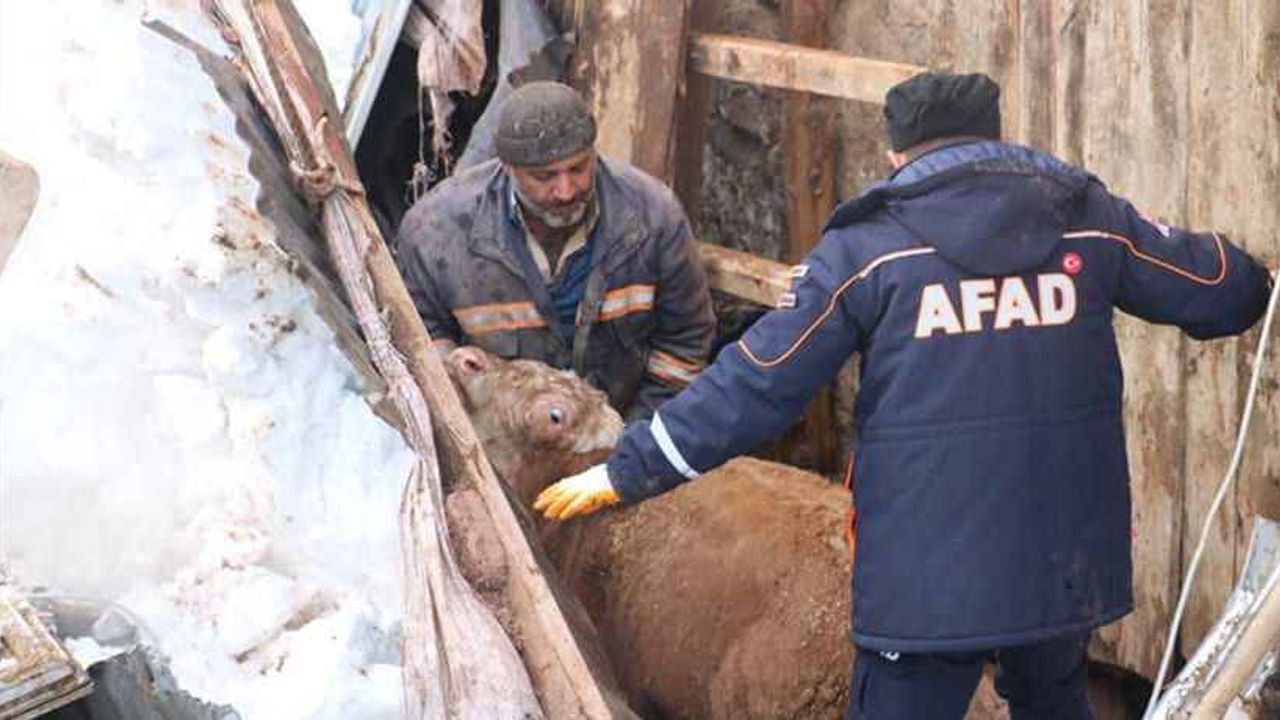 Sivas’ta bir ahırın çatısının çökmesi sonucu iki dana enkaz altında kaldı, danalar başarılı bir operasyonla canlı olarak kurtarıldı.