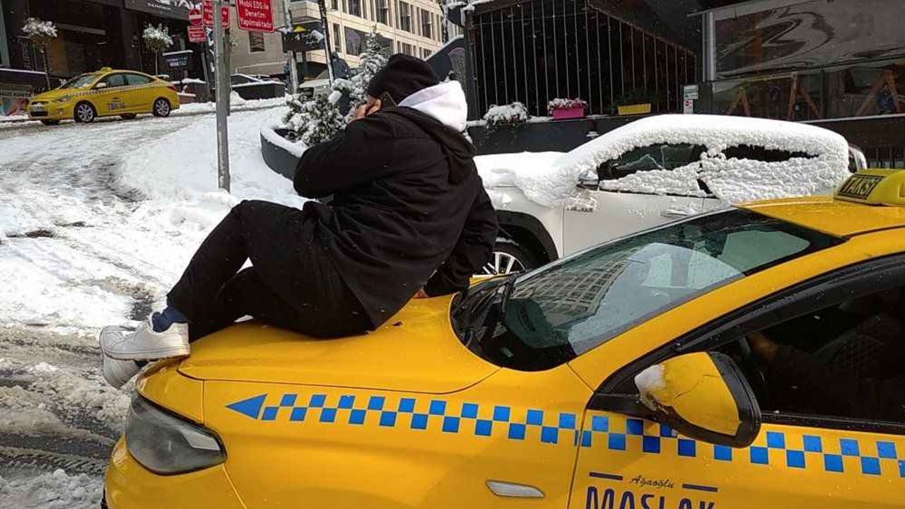 Karda ilerlemekte zorlanan taksiye ağırlık oluşturabilmek için kaputun üzerine oturan vatandaşın bir yandan da telefonla konuşması ilginç görüntüler oluşturdu.