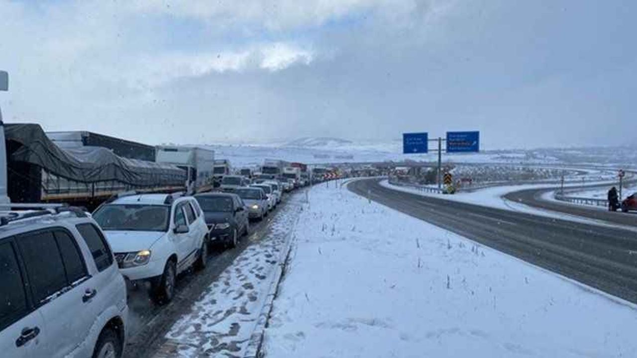 Yoğun kar yağışı sonrası Karabük - Gerede karayolu trafiğe kapandı, kilometrelerce uzun kuyruk oluştu.