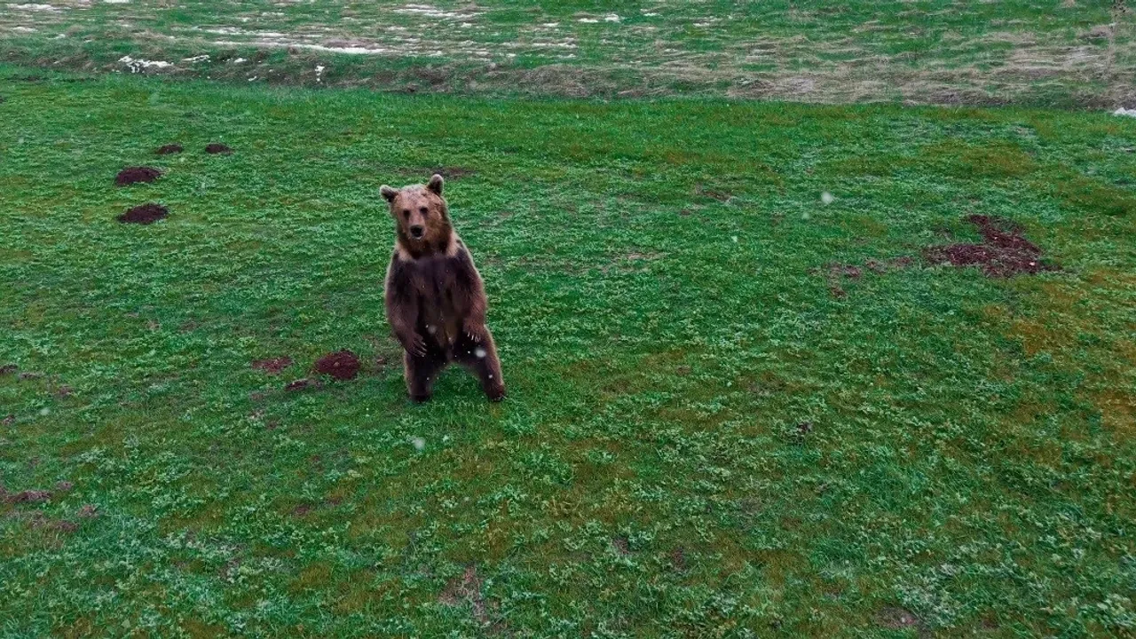 AÇIK ARAZİDE GÖRÜNTÜLENEN AYIDAN DRONA İLGİNÇ TEPKİ