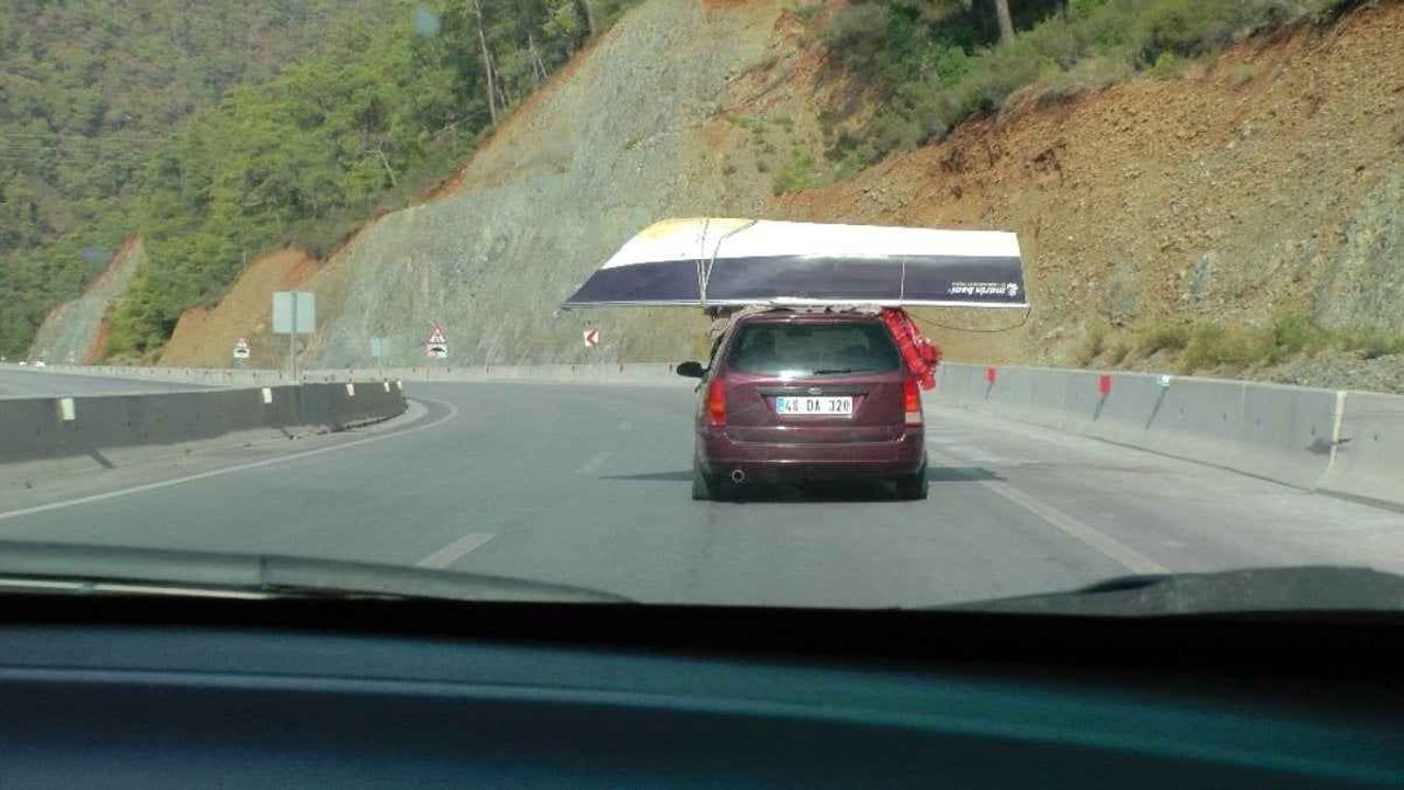 Muğla-Fethiye karayolunda ilginç görüntü! Trafikte insanların canını hiçe sayan sürücü kayığını otomobilinin üzerinde taşıdı.