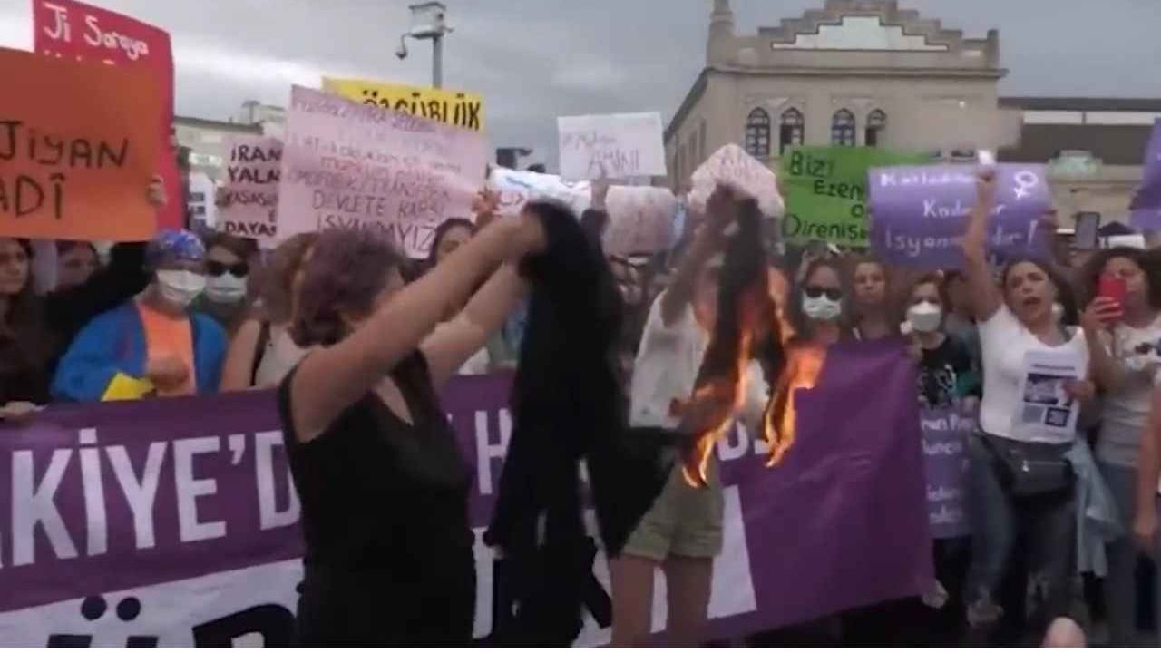 Kadıköy'de toplanan feminist ve sapkın örgüt LGBT destekçisi olan bir grup, İran'lı Mahsa Amani'nin ölümünü protesto ettikleri gösterilerde çarşaf yaktılar.
