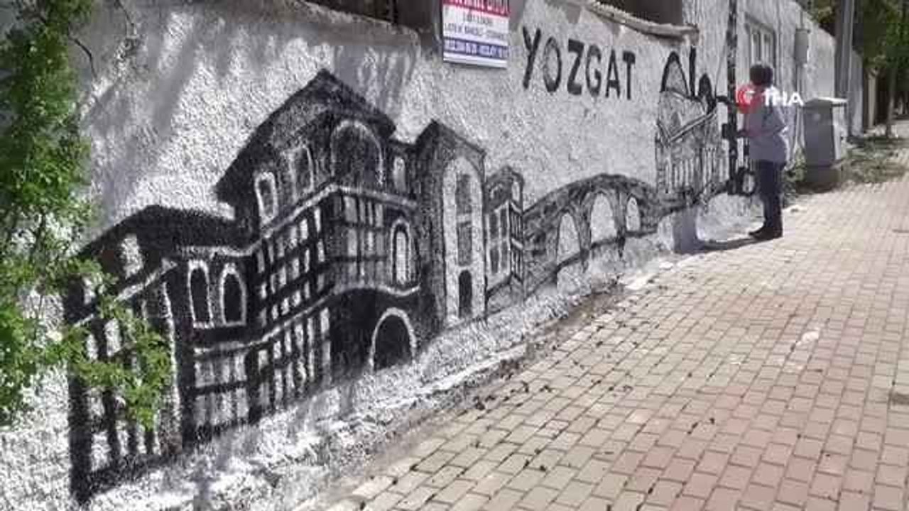 Yozgat’ın Bahçeşehir Mahallesi'nde ikamet eden ve reklamcılıkla uğraşan Zekeriya Gündüz, evinin bahçe duvarını kentin tarihi ve kültürel simgeleriyle donattı.