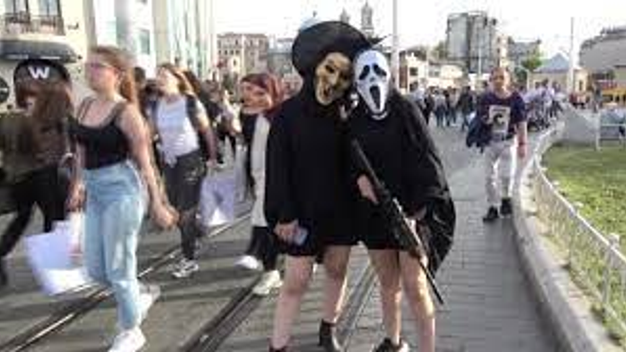 Taksim Meydanı’nda ellerinde oyuncak silahla gezen kostümlü ve maskeli iki kadın, turistleri korkuttu.