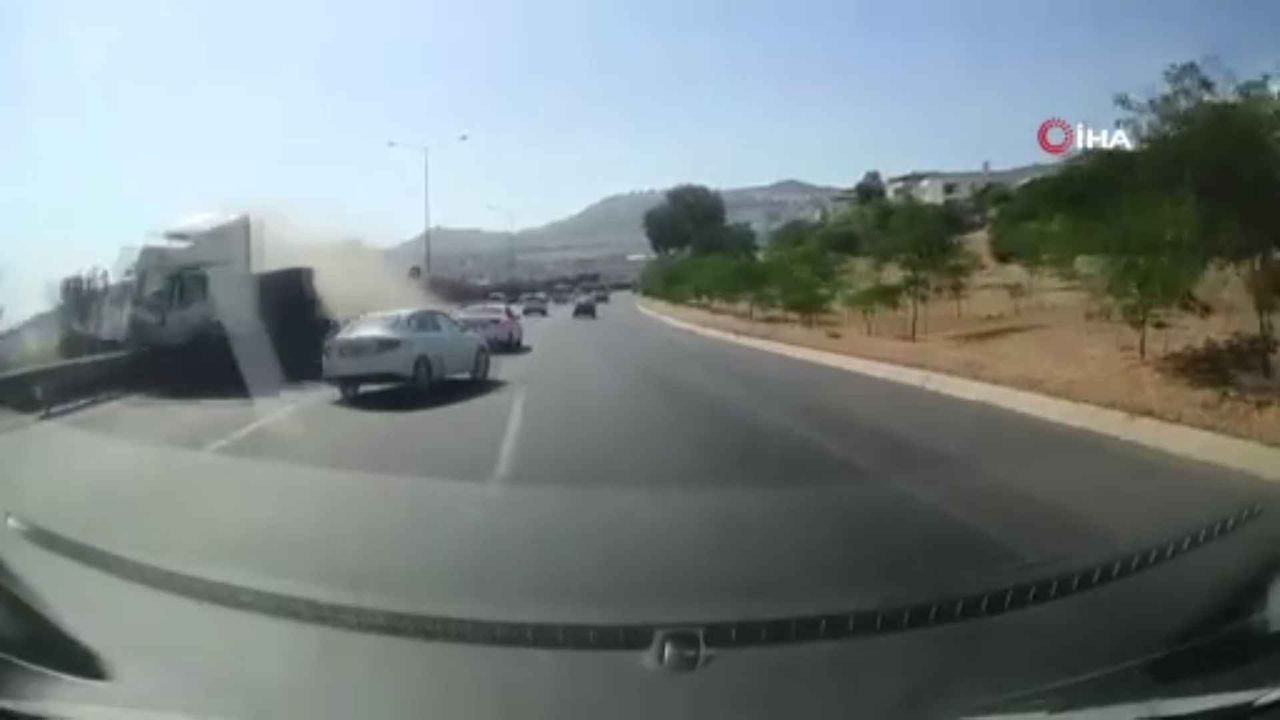 İzmir’de demir yüklü bir tır, lastiğinin patlaması sonucu bariyerleri aşarak karşı şeride geçti. Bazı araçlar, ters şeride giren tırın altında kalmaktan son anda kurtulurken, dehşet veren kaza anı ise bir aracın kamerasına yansıdı.