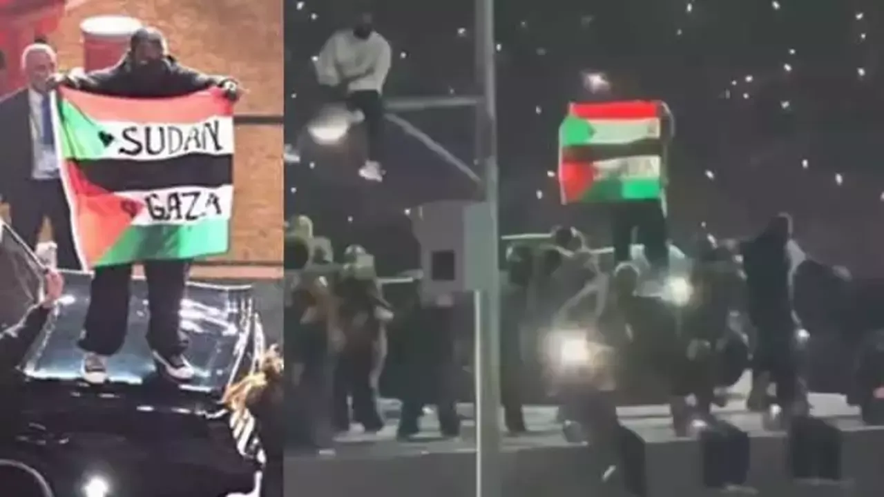 Rapçi Kendrick Lamar'ın devre arısı performansı sırasında elinde Sudan ve Filistin...