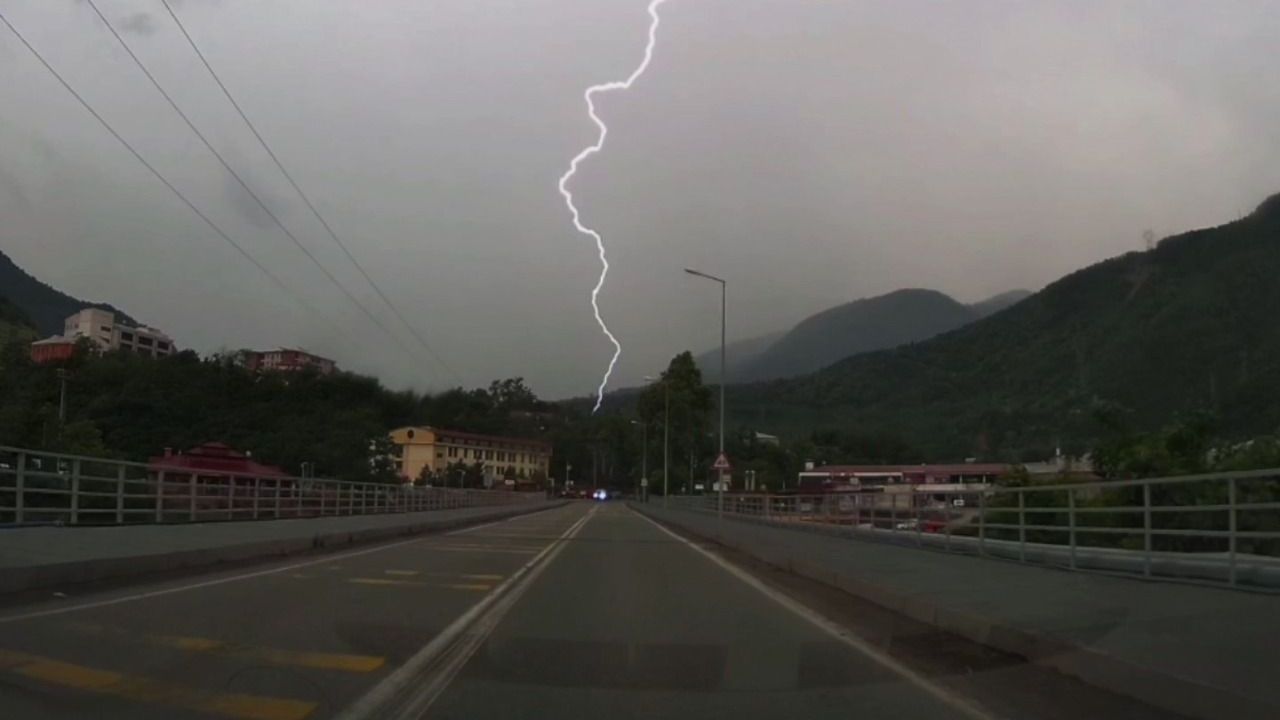 Artvin'de yıldırımın düşme anı araç kamerasıyla anbean kaydedildi.