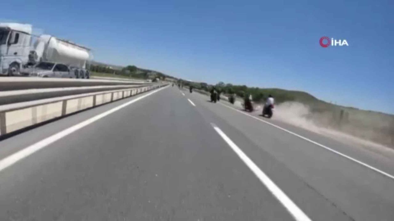 Çatalca’da zaman zaman trafikte tek teker üzerinde ilerleyen motosikletli gruptaki bir sürücü virajı alamayarak devrildi. Bir başka sürücü de hareket halindeki diğer motosiklete çarparken, kazada 2 kişi yaralandı. Kaza anı kameraya yansıdı.