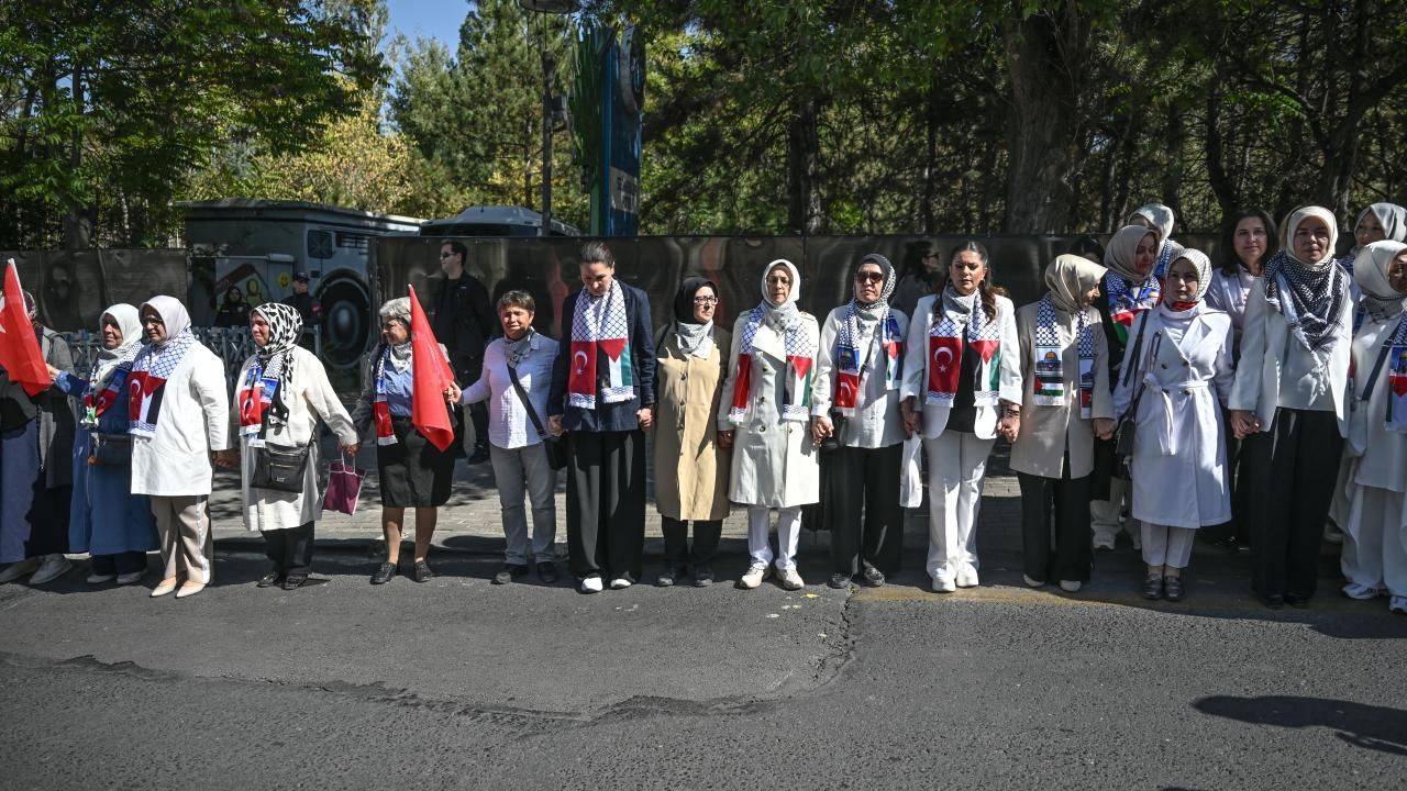 Beyaz renk kıyafetler giyen ve boyunlarına kefiye bağlayan kadınlar, ellerinde Filistin ve Türk bayrakları ile "Filistin için tek yüreğiz", "Özgür Filistin", "İşgale son", "Filistin özgür olacak", "Barış kadınla mümkün" yazılı pankartlar taşıdı.