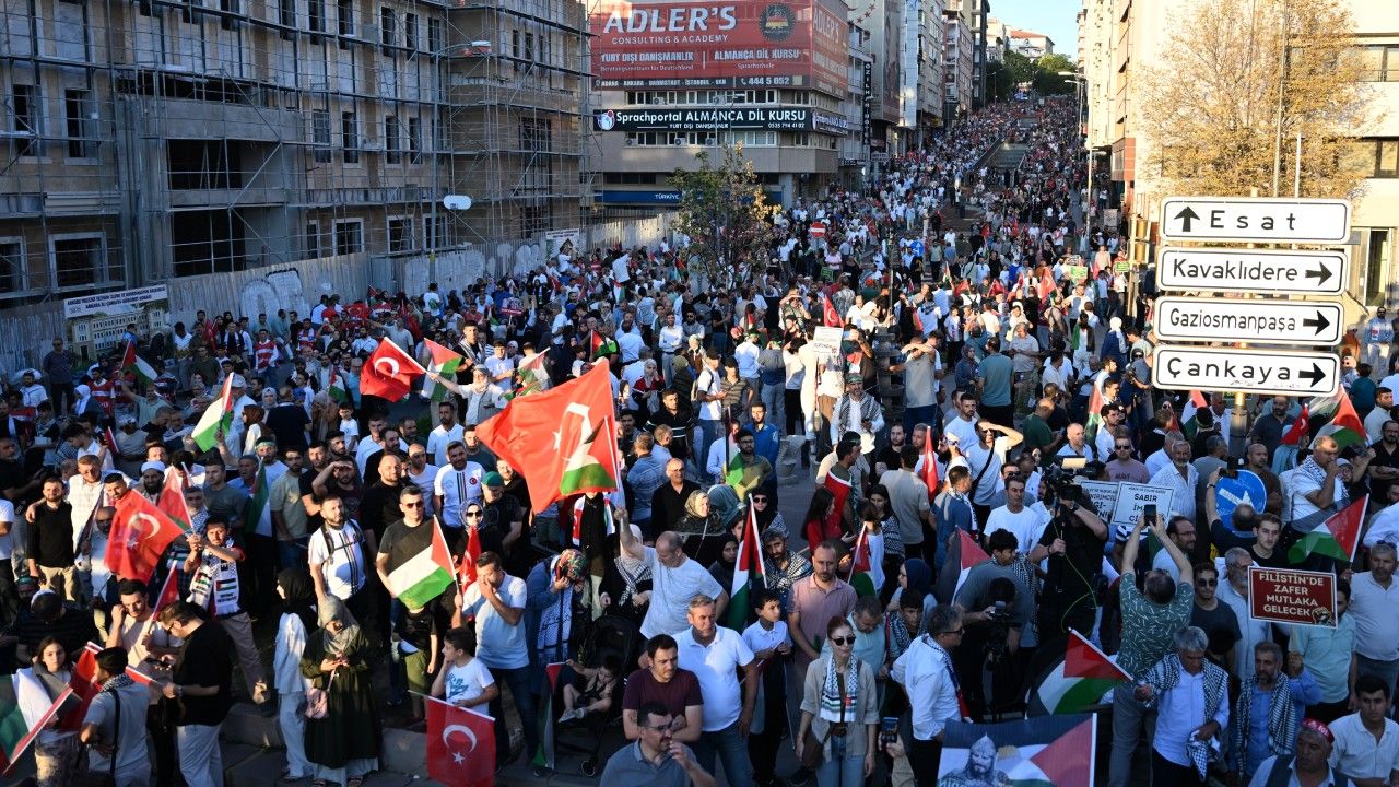Buradan Türkiye Büyük Millet Meclisi'ne (TBMM) doğru yürüyüşe geçen grup, ellerinde "çocuklar ölürken sessiz kalınmaz", "Gazze'ye insani koridor hemen şimdi" yazılı pankartlarla İsrail aleyhinde sloganlar attı, tekbir getirdi.