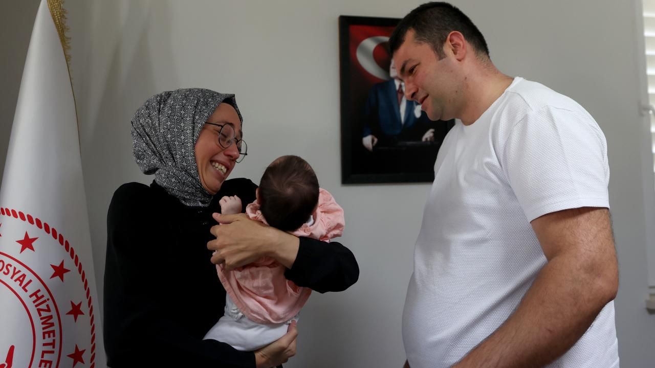 Aile ve Sosyal Hizmetler İl Müdürlüğünde düzenlenen "Koruyucu Aile Tanışma ve Sözleşme İmza Töreni"nde iki aylık "Begüm" bebeği ilk defa kucaklarına alan anne ve baba gözyaşı döktü.