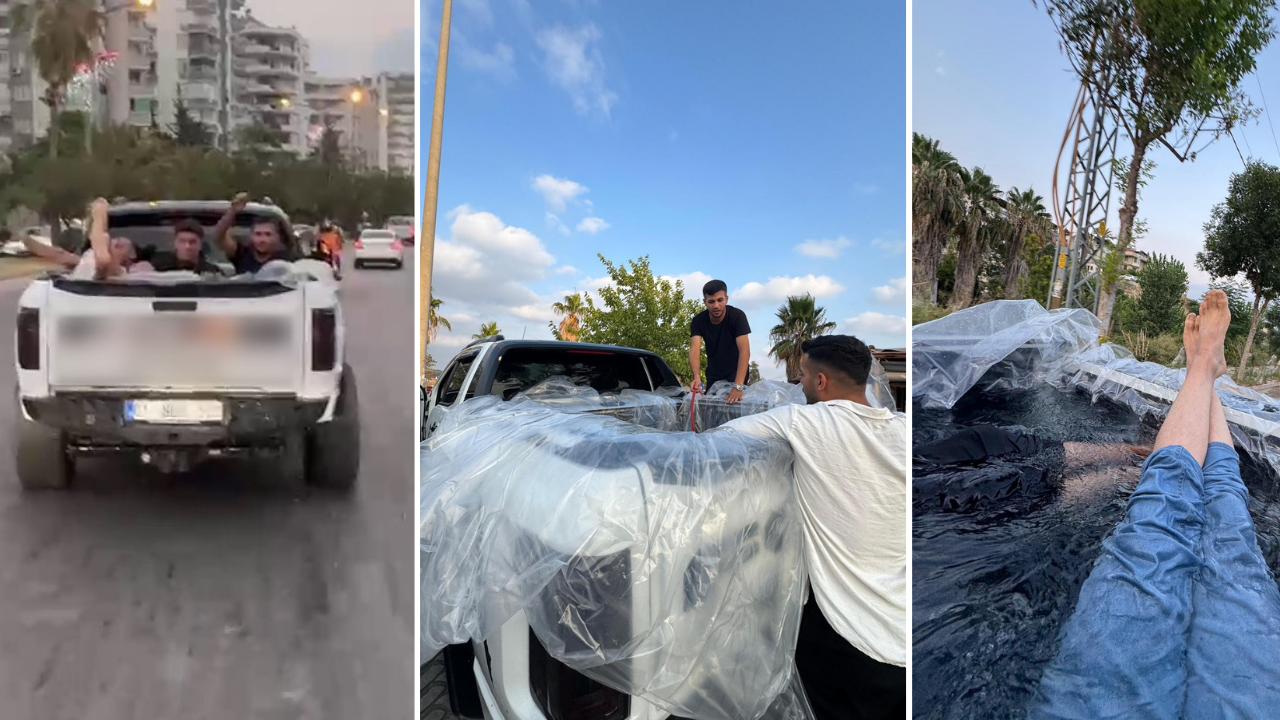 Aşırı sıcakların etkili olduğu Adana'da yaşayan Ömer Oğuz, geçen ay arkadaşlarıyla birlikte aşırı sıcaktan bunalınca aracın kasasını havuza çevirdi.