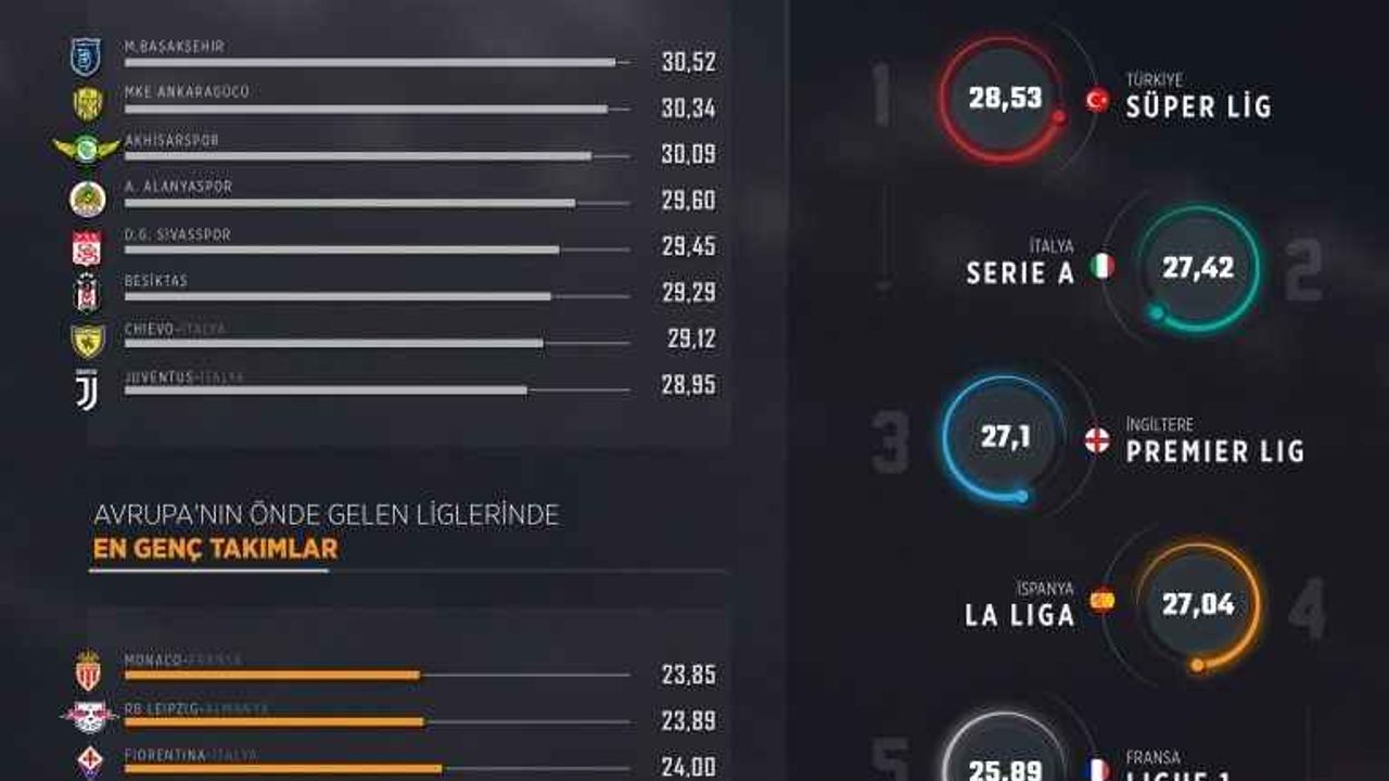 Süper Lig, Avrupa’nın önde gelen ligleri İngiltere Premier Lig, İspanya Ligi (La Liga), İtalya Ligi (Serie A), Almanya Ligi (Bundesliga) ve Fransa Ligi’nde (Ligue 1) şu ana kadar forma giyen futbolcuların yaş ortalaması bakıldığında, en yaşlı lig olarak dikkati çekiyor.