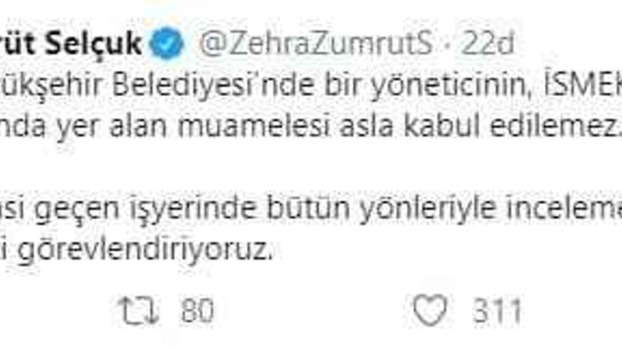 Bakan Selçuk, Twitter hesabından yaptığı paylaşımda, “İstanbul Büyükşehir Belediyesi’nde bir yöneticinin, İSMEK çalışanlarına yönelik basında yer alan muamelesi asla kabul edilemez. Konuyu, bahsi geçen işyerinde bütün yönleriyle incelemek üzere bir iş müfettişimizi görevlendiriyoruz.” ifadelerini kullandı.