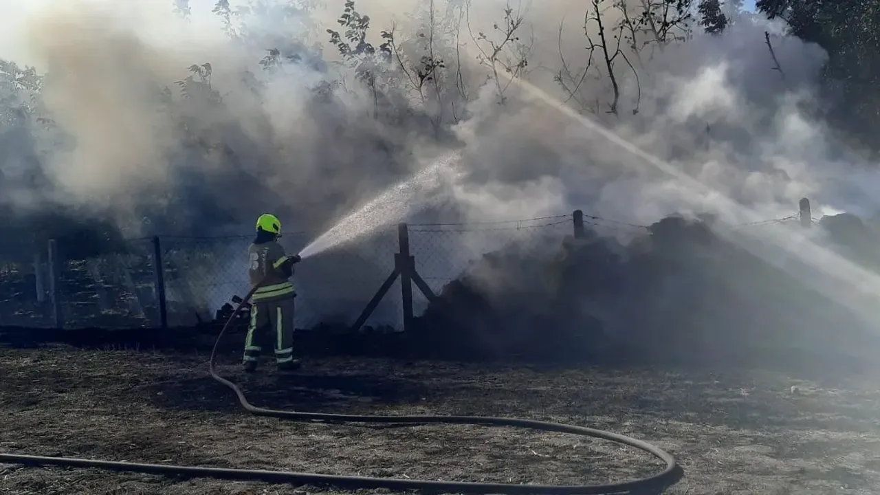 Gündoğdu Mahallesi'nde depolanan saman balyalarında henüz bilinmeyen bir nedenle yangın çıktı.