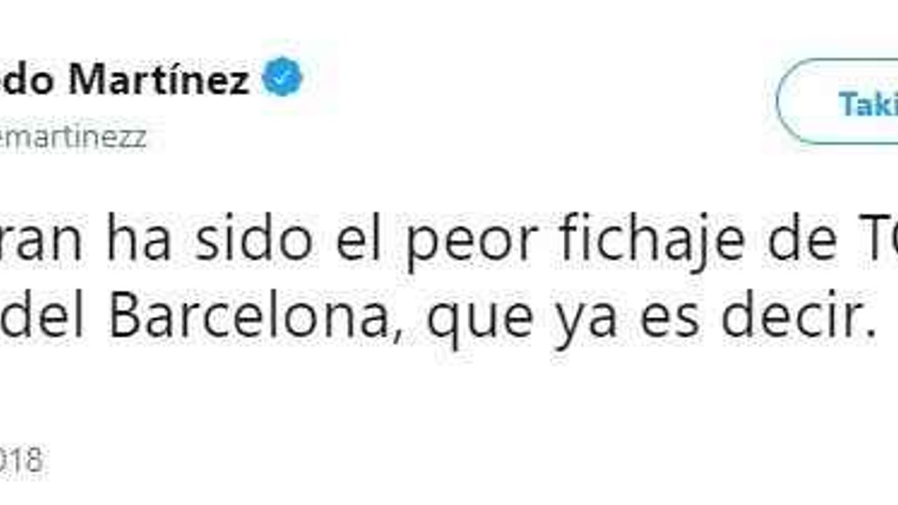 Geçtiğimiz günlerde yaşanan olaylar sonrasında Arda Turan tüm dünya basınında gündem olmuş ve çokça tartışılmıştı. İspanyol basını Arda Turan’ı yerden yere vururken, İspanyol gazeteci Alfredo Martinez’den ağır bir yorum geldi. Arda için, Barcelona tarihinin en kötü transferi, diyen gazeteci bunu Twitter’da paylaştı.