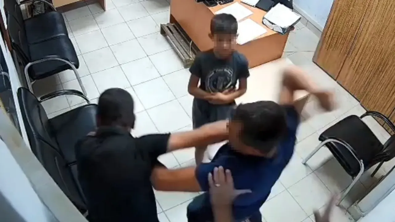 Baba, oğluyla polis merkezinin içine kaçarken, kayınbirader darbetmeye başladı.