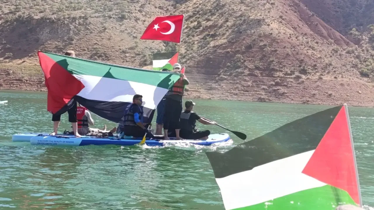 Ilısu Prof. Dr. Veysel Eroğlu Baraj Gölü kıyısında toplanan vatandaşlar, ellerinde Türk ve Filistin bayraklarıyla Gazze’ye yönelik saldırılara tepki gösterdi.
