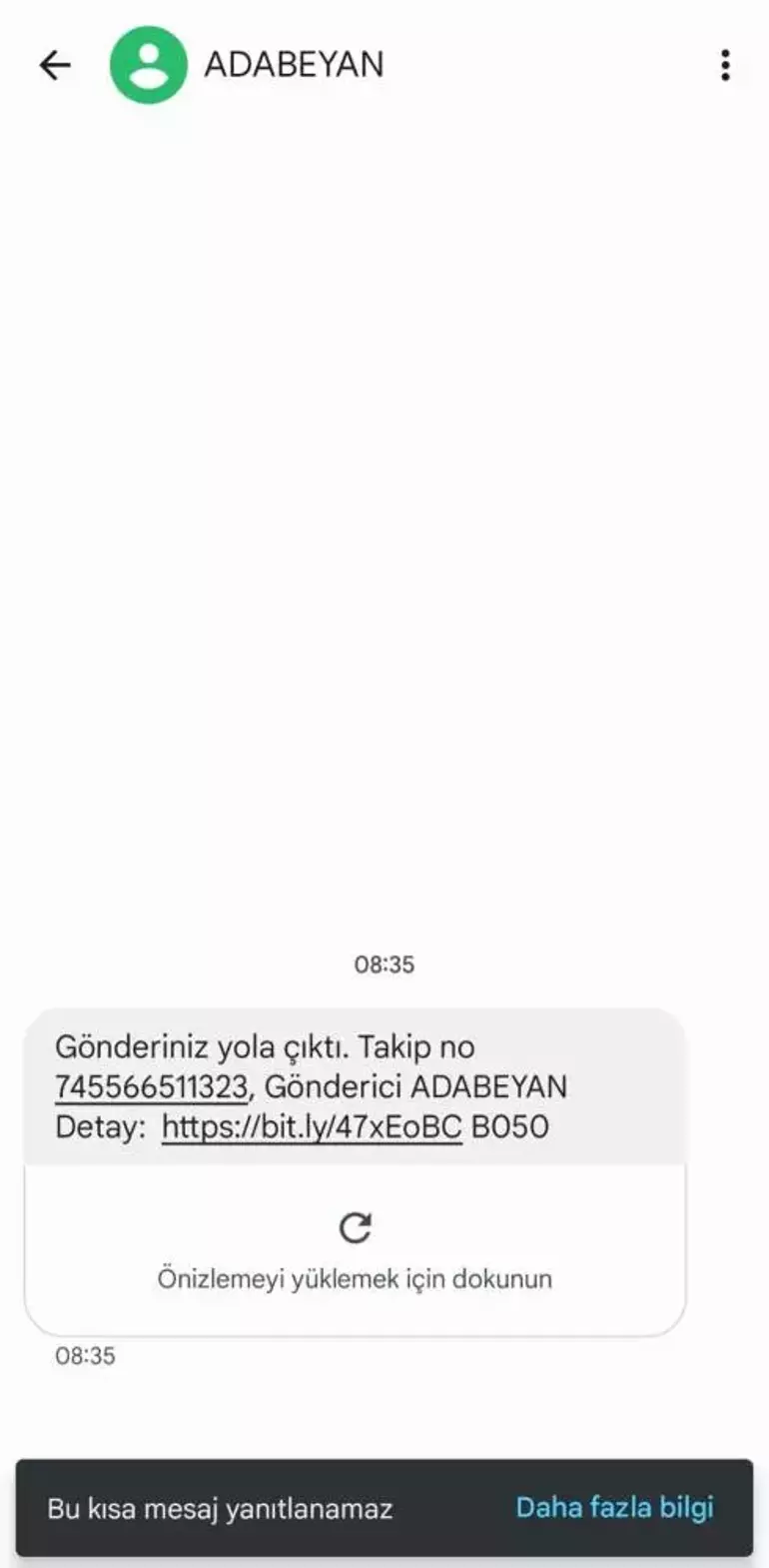 Milyonlarca cep telefonu kullanıcısına bu sabah saatlerinde bir alışveriş sitesinin de ismi ve uygulaması taklit edilerek "SMS ile gönderilen Adabeyan kargo gönderiniz yola çıktı, kargo takip '745566511323' numarası" şeklindeki mesaj tedirginliğe yol açtı.