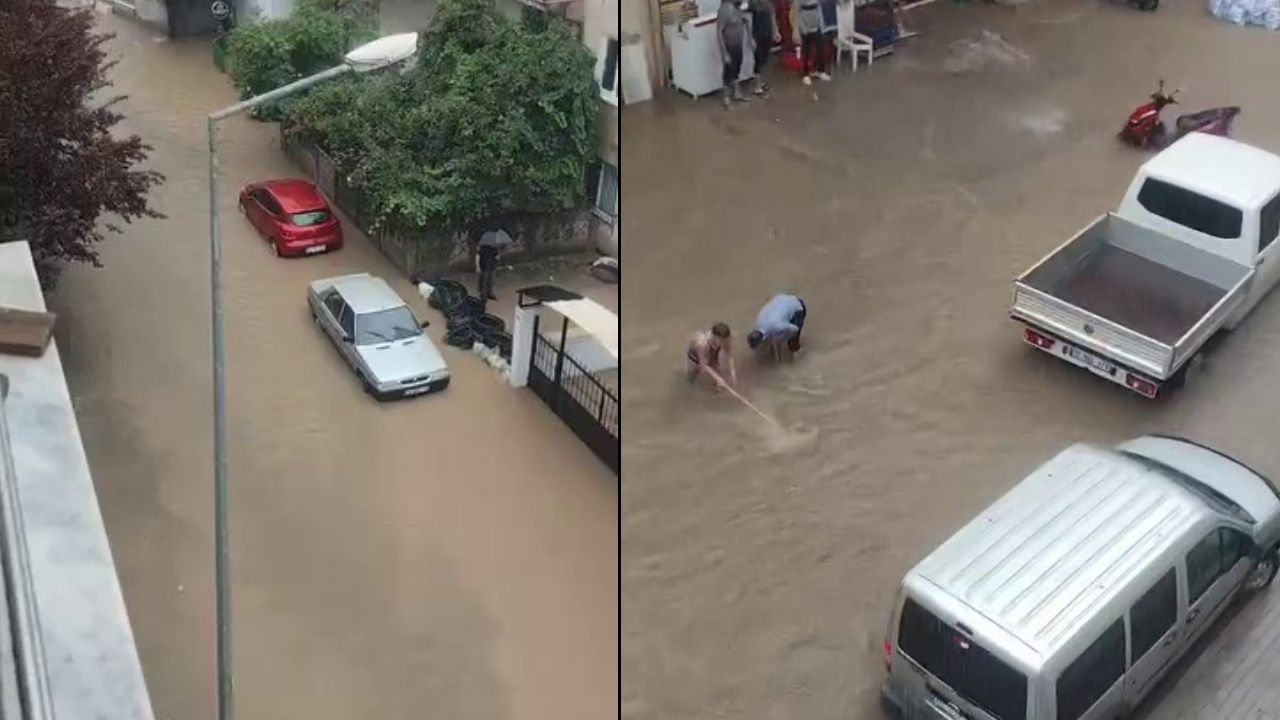 Bursa'nın Kestel ilçesinde öğle saatlerinde aniden bastıran sağanak yağış, hayatı olumsuz etkiledi. Dakikalar içinde cadde ve sokaklar suyla dolarken, bazı araçlar sular altında kaldı. Bodrum katlarını su basan vatandaşlar panik yaşadı.