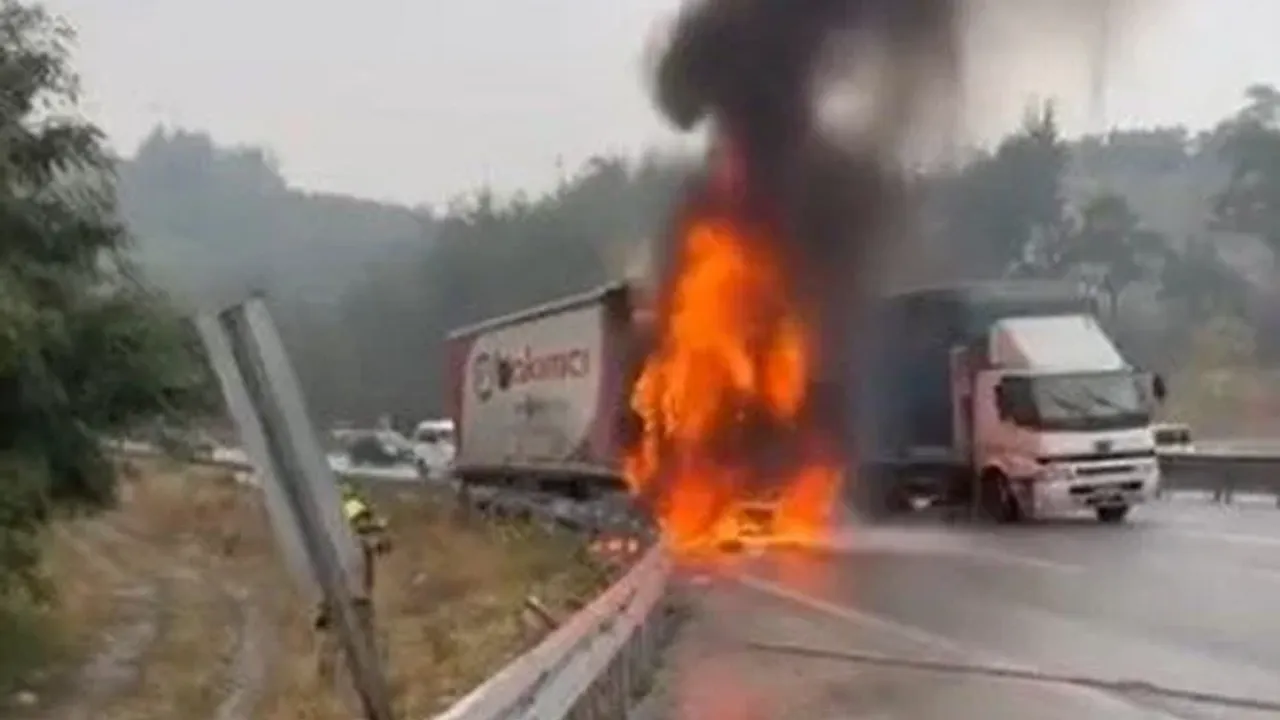 TIR'ın motor bölümünde çıkan yangın kısa sürede büyüyünce alevler ön kısmını sardı.