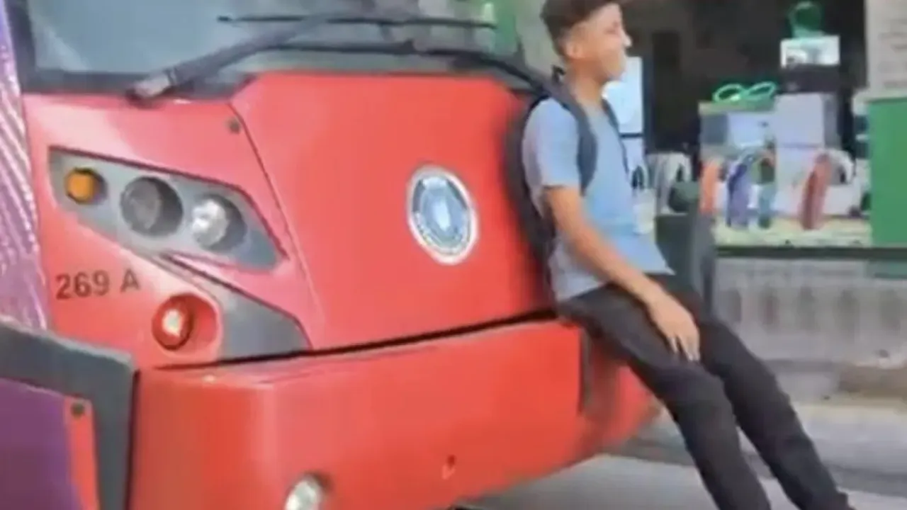 Görüntülerde, çocuğun hiçbir güvenlik önlemi olmadan tramvayın arkasında yolculuk ettiği anlar net bir şekilde görüldü.