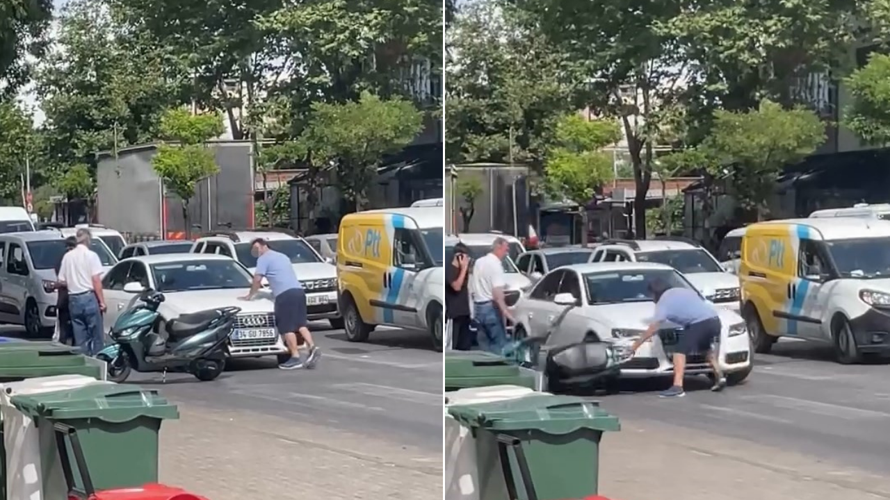 Tartışmanın hararetlenmesi üzerine motosikletinden inen sürücü, aracın önünü kesip sileceği kırdı.