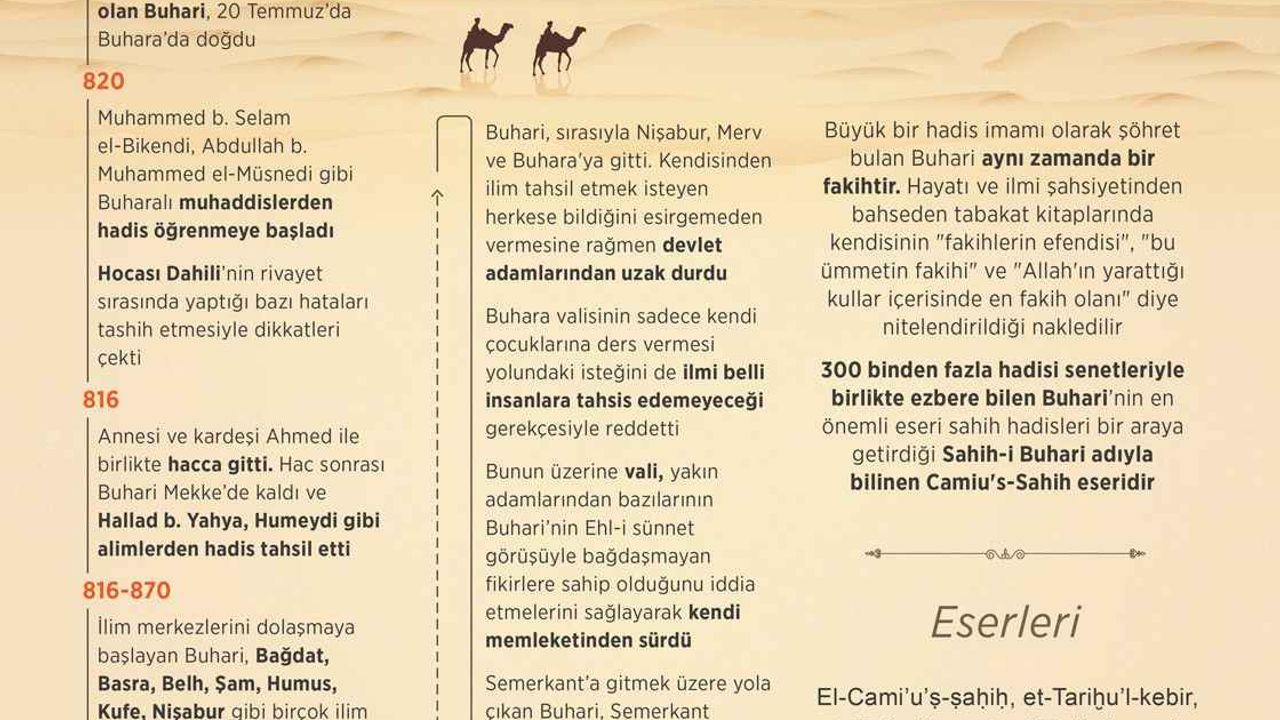 AA muhabirinin kaynaklardan derlediği bilgilere göre, asıl adı Muhammed bin İsmail olan Buhari, 20 Temmuz 810’da Buhara’da doğdu. Babası İsmail, Malik bin Enes ve Abdullah bin Mübarek gibi alimlerden hadis öğrenen bir kişidir. Buhari henüz çocuk yaştayken babasının vefatı üzerine dindar bir kadın olarak bilinen annesi tarafından yetiştirildi.