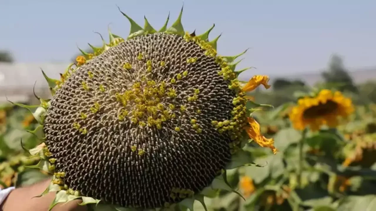 Boyu 2 metreyi bulan ayçiçeklerinin biçerdöverle hasat edilmesinin ardından çekirdekleri branda üzerinde kurutulmaya bırakılıyor.
