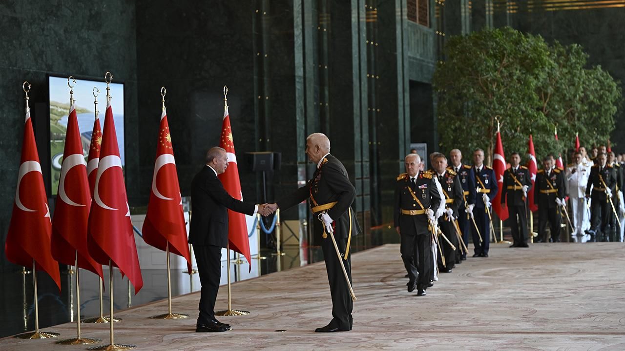 Cumhurbaşkanlığı Muhafız Alayı Bandosu'nun marşlar seslendirdiği tören, başkentte görevli askeri personeli temsilen her rütbeden asker ile sivil personelin Cumhurbaşkanı Erdoğan'a tebriklerini sunmasıyla sona erdi.